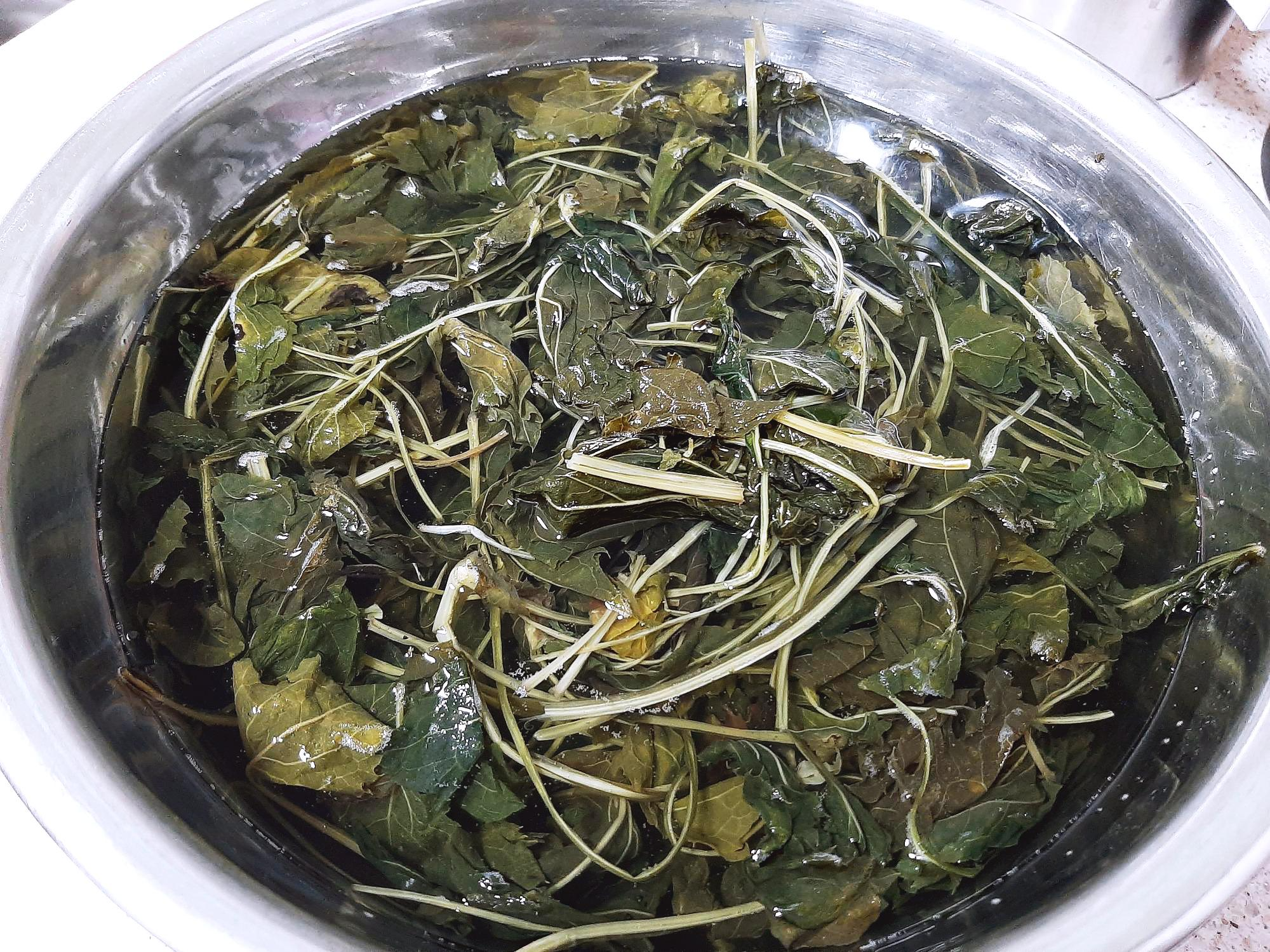 3. 한 시간 불리면 줄기는 조금 딱딱하지만 잎은 부드럽게 부풀어 오릅니다.불린 취나물은 물에 살짝 씻어~