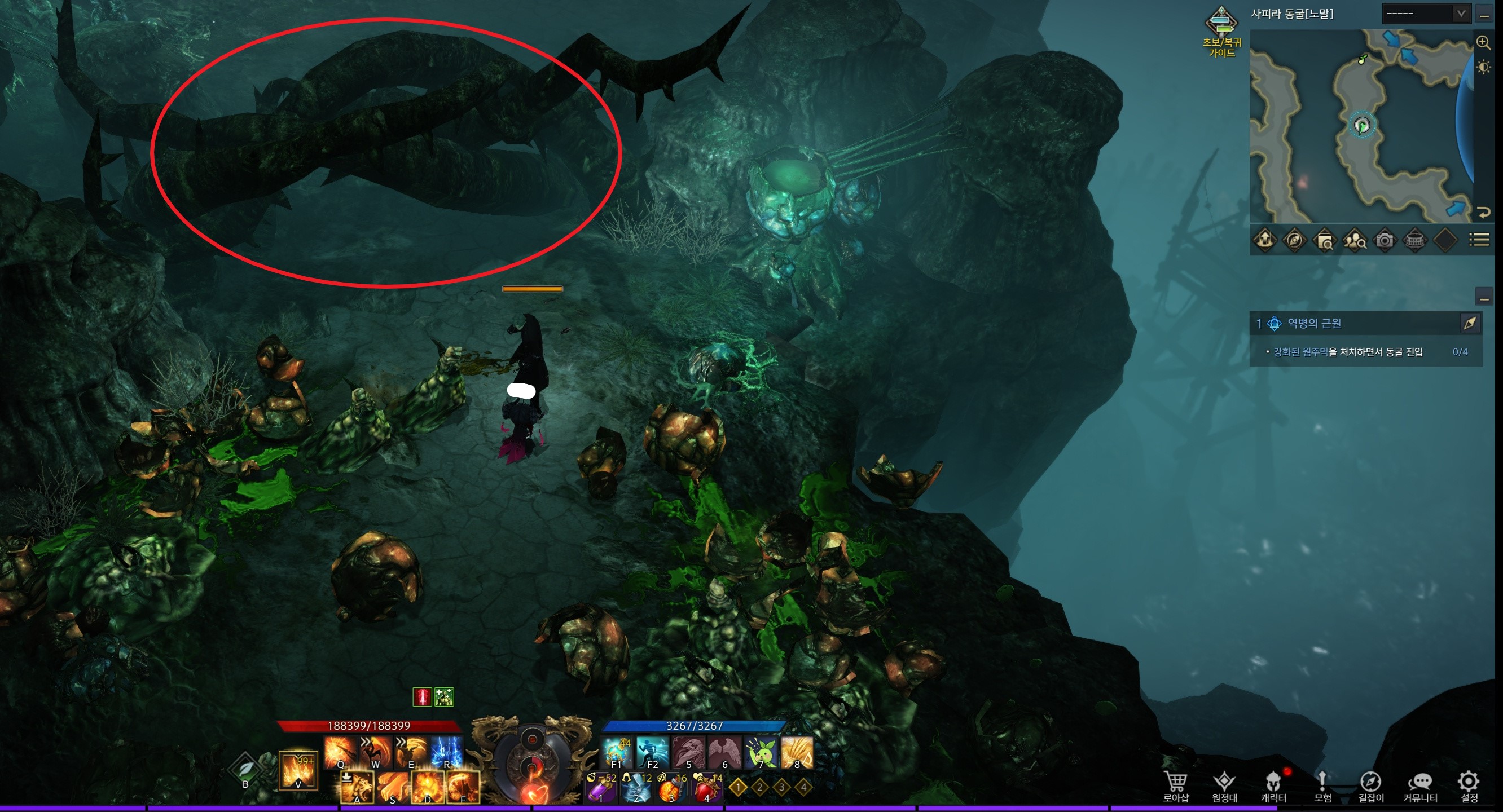 해당 위치로 이동하면 덩굴이 막습니다. 당신을 따라 오는 모든 몬스터를 죽여 입장하십시오.